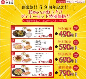 【超お得】中華・幸楽苑、創業69年祭!ディナーセット4種がほぼ半額!9月30日(土)まで!